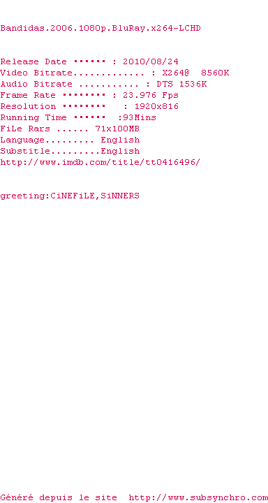 Voir le nfo de la release Bandidas.2006.1080p.BluRay.x264-LCHD