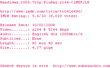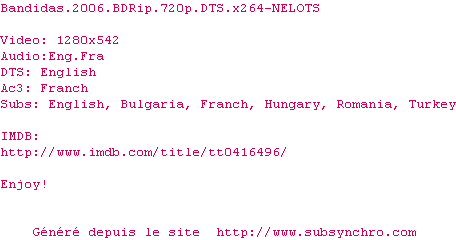 Voir le nfo de la release Bandidas.2006.BDRip.720p.DTS.x264-NELOTS