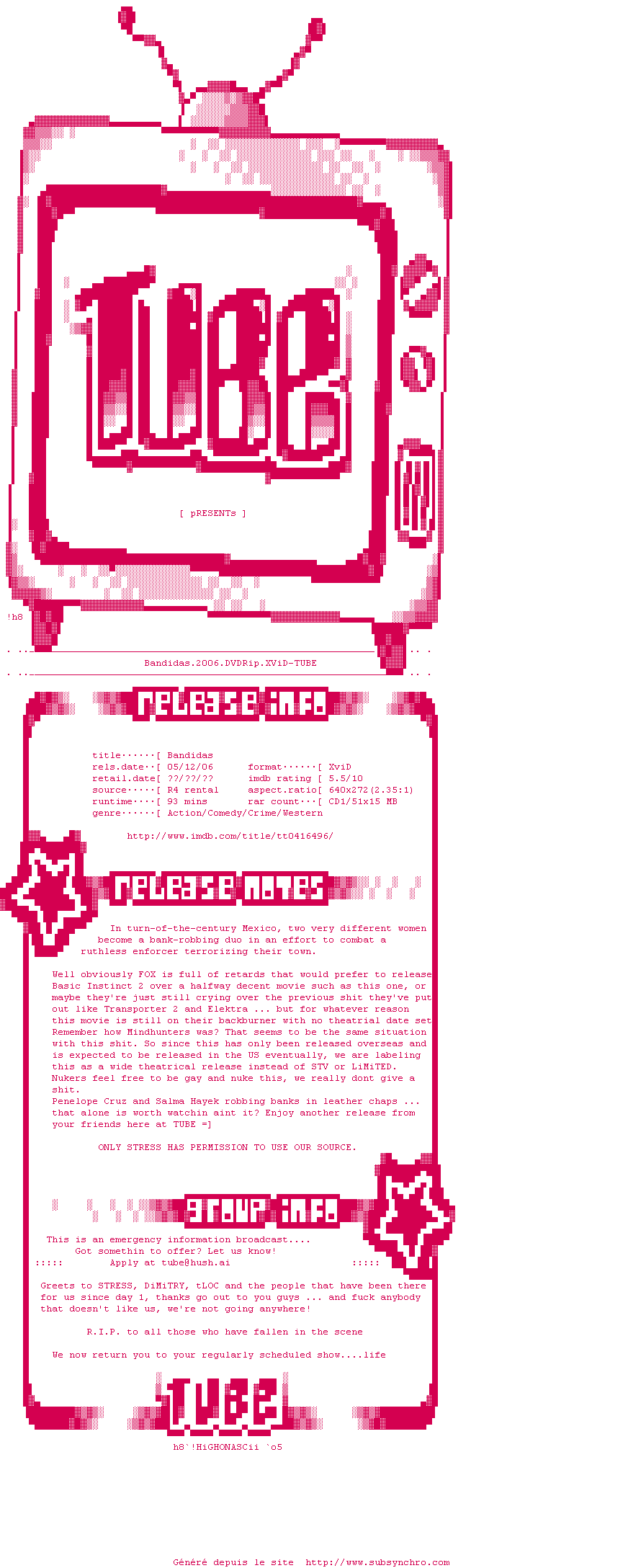 Voir le nfo de la release Bandidas.2006.DVDRip.XViD-TUBE