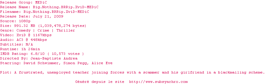 Voir le nfo de la release Big.Nothing.BRRip.XviD-MEDiC