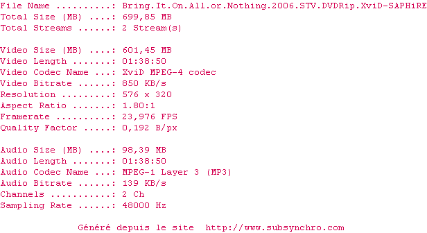 | Voir le nfo de la release Bring.It.On.All.or.Nothing.2006.STV.DVDRip.XviD-SAPHiRE | SAPHiRE | Bring.It.On.All.or.Nothing.2006.STV.DVDRip.XviD-SAPHiRE OpenSubtitles | 0 fichier |