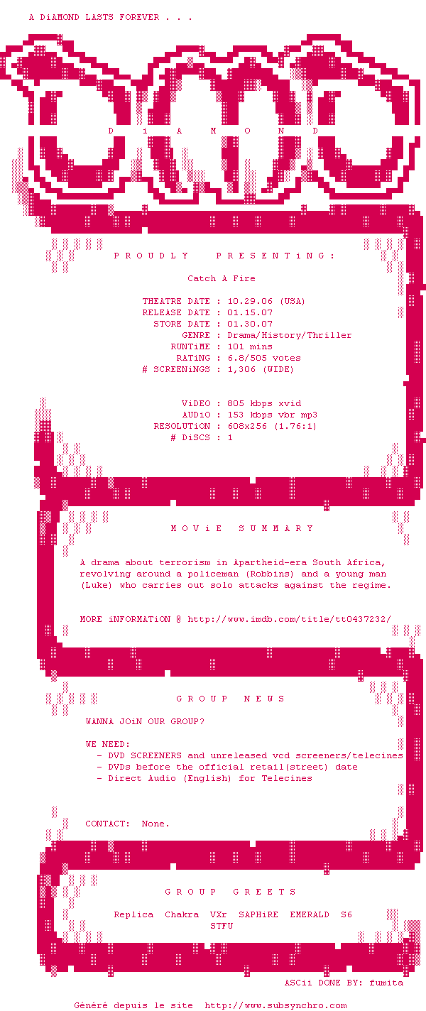 | Voir le nfo de la release Catch.A.Fire.DVDRip.XviD-DiAMOND | DiAMOND | Catch.A.Fire.DVDRip.XviD-DiAMOND OpenSubtitles | 0 fichier | ||