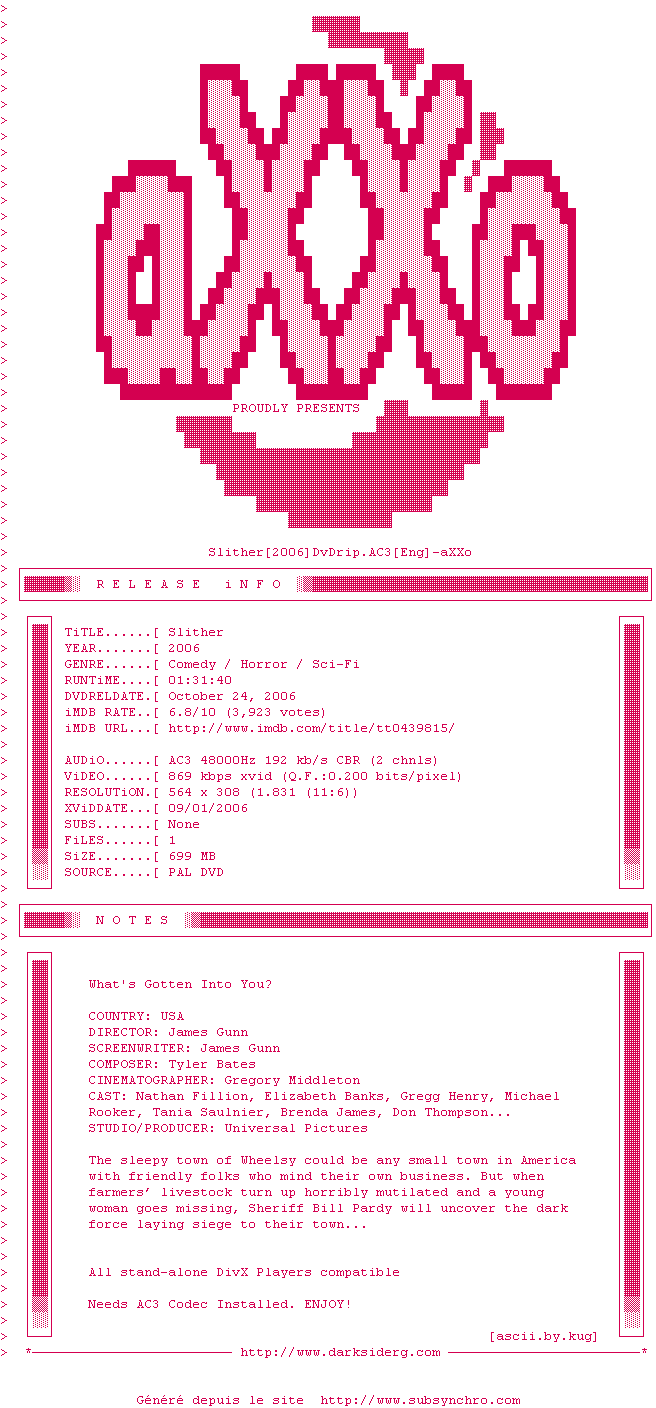 Voir le nfo de la release Slither.2006.DvDrip.AC3-aXXo