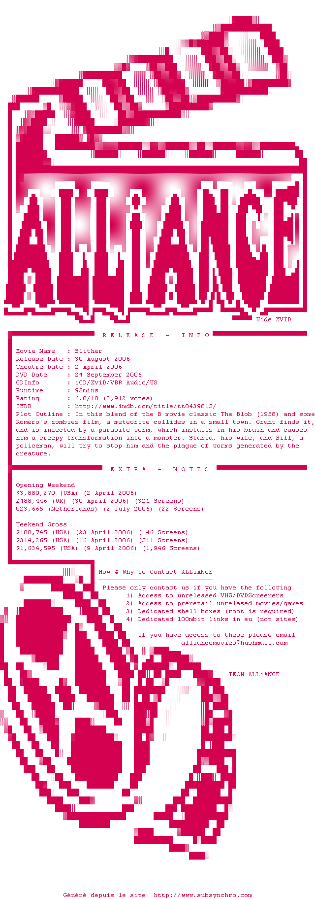 Voir le nfo de la release Slither.2006.DVDRip.XviD-ALLiANCE
