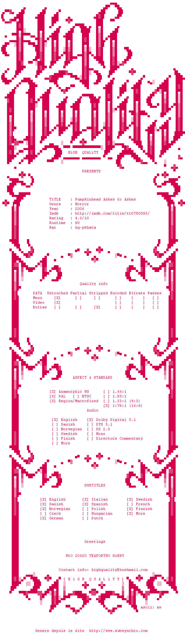 Voir le nfo de la release Pumpkinhead.Ashes.To.Ashes.2006.MULTiSUBS.PAL.DVDR-HiGHQUALiTY