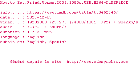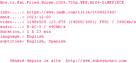 Voir le nfo de la release How.To.Eat.Fried.Worms.2006.720p.WEB.H264-DiMEPiECE