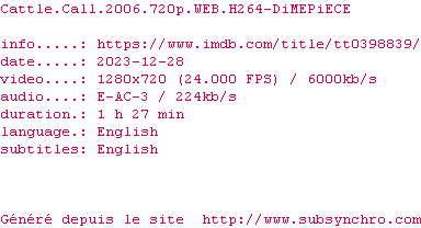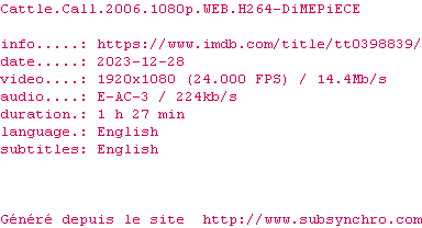 | Voir le nfo de la release Cattle.Call.2006.1080p.WEB.H264-DiMEPiECE | DiMEPiECE | Cattle.Call.2006.1080p.WEB.H264-DiMEPiECE OpenSubtitles | 0 fichier | ||
