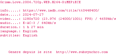 | Voir le nfo de la release Grimm.Love.2006.720p.WEB.H264-DiMEPiECE | DiMEPiECE | Grimm.Love.2006.720p.WEB.H264-DiMEPiECE OpenSubtitles | 10/06/2025 | Disponible en FANSUB | 1 fichier |