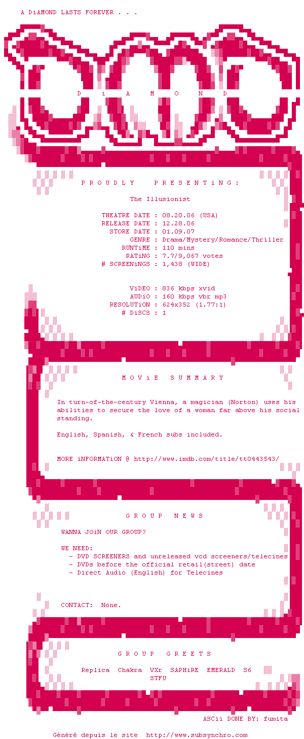 Voir le nfo de la release The.Illusionist.DVDRip.XviD-DiAMOND