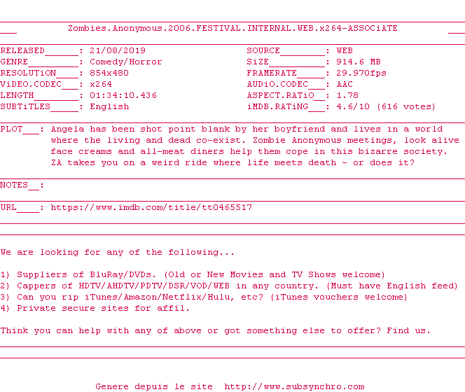 Y avez-vous pense ? Nous proposons déjà 1939 sous-titres pour le film Zombies Anonymous. Avez-vous essaye de voir si ces sous-titres etaient compatibles avec cette release ? On vous laisse le soin de tester cela pour nous et de contribuer au site en postant le sous-titre en cas de compatiblite constatee !