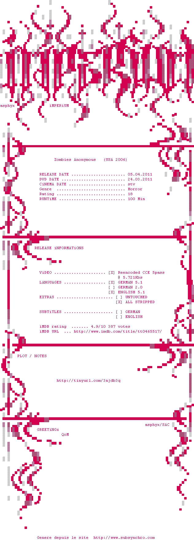 Y avez-vous pense ? Nous proposons déjà 1939 sous-titres pour le film Zombies Anonymous. Avez-vous essaye de voir si ces sous-titres etaient compatibles avec cette release ? On vous laisse le soin de tester cela pour nous et de contribuer au site en postant le sous-titre en cas de compatiblite constatee !