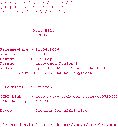 Y avez-vous pense ? Nous proposons déjà 1939 sous-titres pour le film Meet Bill. Avez-vous essaye de voir si ces sous-titres etaient compatibles avec cette release ? On vous laisse le soin de tester cela pour nous et de contribuer au site en postant le sous-titre en cas de compatiblite constatee !