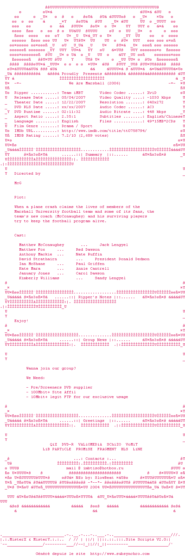 | Voir le nfo de la release We.Are.Marshall.2006.DVDRip.XViD-iMBT | iMBT | We.Are.Marshall.2006.DVDRip.XViD-iMBT OpenSubtitles | 0 fichier | ||