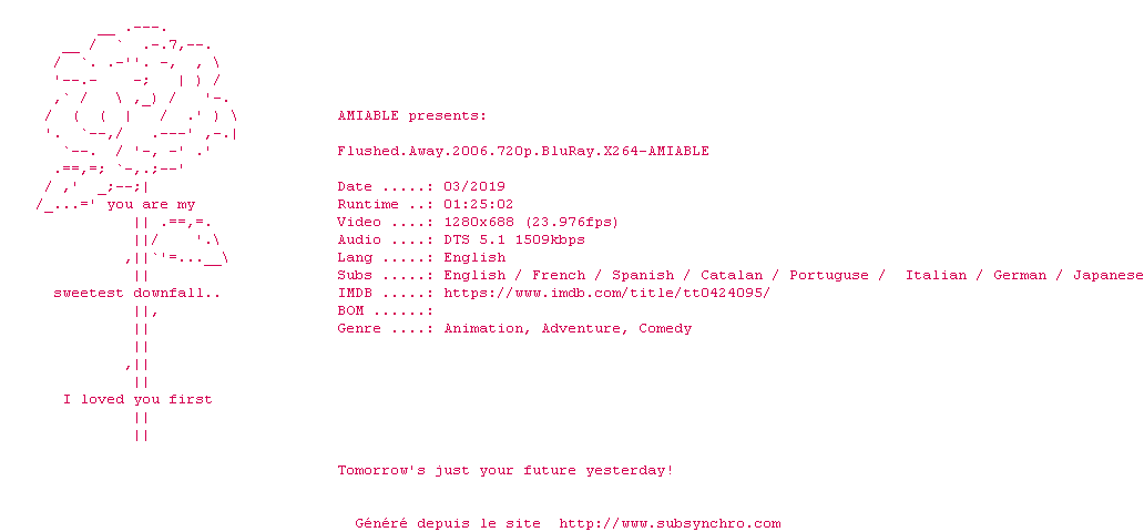 Voir le nfo de la release Flushed.Away.2006.1080p.BluRay.x264-AMIABLE