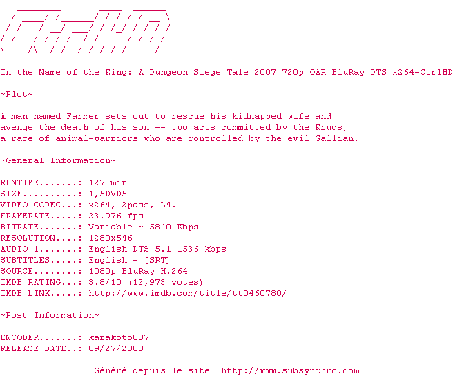 Voir le nfo de la release In.the.Name.of.the.King.A.Dungeon.Siege.Tale.2007.720p.OAR.BluRay.DTS.x264-CtrlHD