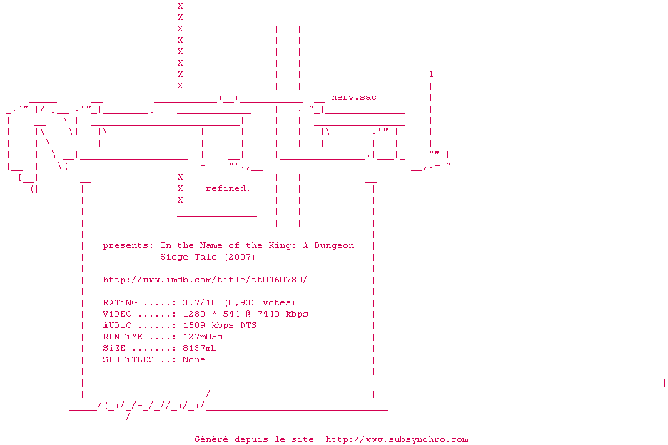 Voir le nfo de la release In.The.Name.Of.The.King.A.Dungeon.Siege.Tale.720p.BluRay.x264-REFiNED