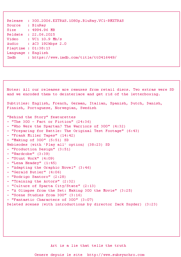 il a réussi a donné une autre dimension au genre péplum avec une mise en scène excentrique a shouait, du muscle de l'humour du muscle de l'humour, et le scénario tient plutôt bien la route. par contre les ralentis à chaque bastons ça devient un peu lassant a force.. mais d'un autre coté, pour certains, ils démontrent a eux seuls toute l'originalité de ce film.