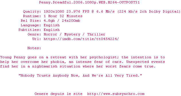 Y avez-vous pense ? Nous proposons déjà 2124 sous-titres pour le film Penny Dreadful. Avez-vous essaye de voir si ces sous-titres etaient compatibles avec cette release ? On vous laisse le soin de tester cela pour nous et de contribuer au site en postant le sous-titre en cas de compatiblite constatee !
