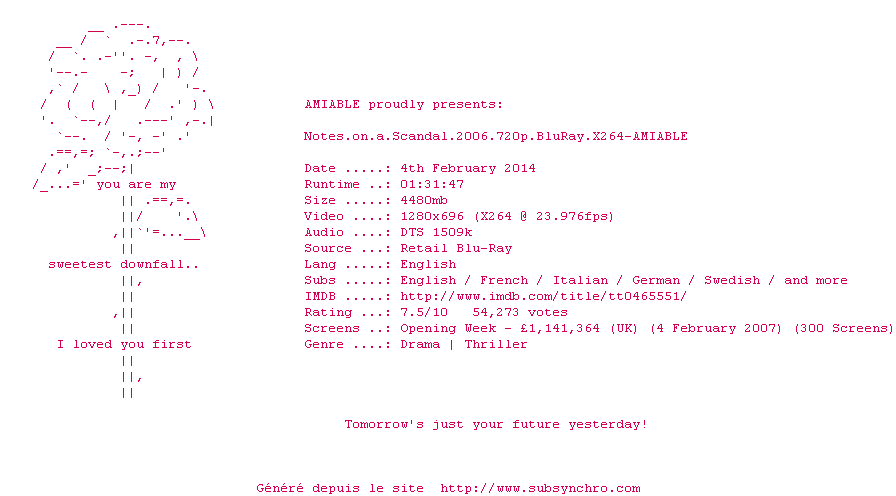 Voir le nfo de la release Notes.on.a.Scandal.2006.720p.BluRay.X264-AMIABLE