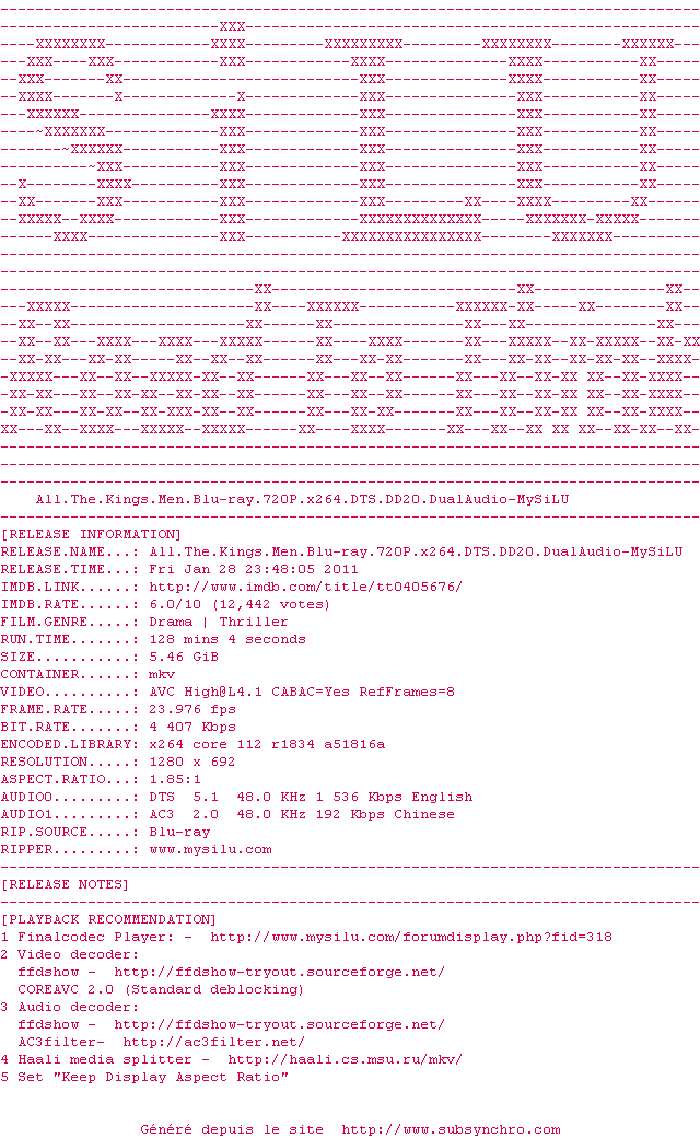 | Voir le nfo de la release All.The.Kings.Men.Blu-ray.720P.x264.DTS.DD20.DualAudio-MySiLU | MySiLU | All.The.Kings.Men.Blu-ray.720P.x264.DTS.DD20.DualAudio-MySiLU OpenSubtitles | 0 fichier |