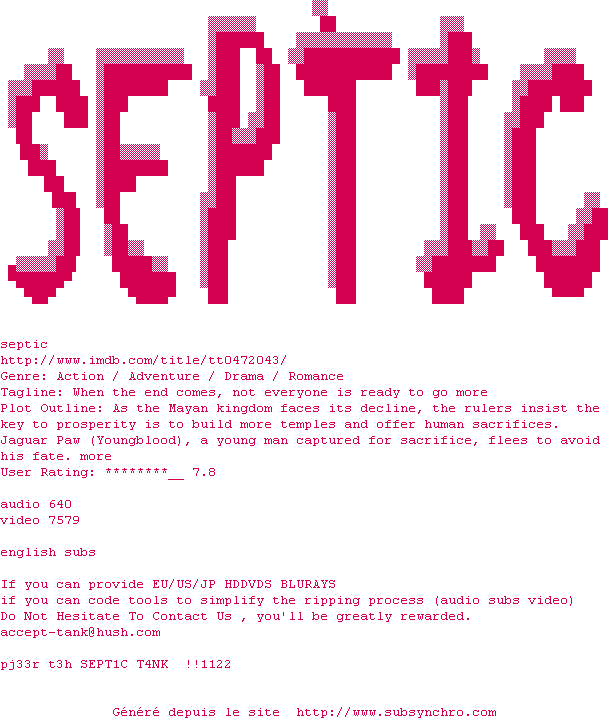 Le commentaire de buzthafuzz Commente par buzthafuzz (99), Le Vendredi 15 Novembre 2013 à 14h21 Moi aussi j&39;ai bien aimé. La scène du sacrifice est superbe. Bon, comme d&39;hab avec Mel Gibson, c&39;est sanglant, mais pour une fois, le contexte le justifie. Franchement prenant et dépaysant. 6.5 / 10 1 0