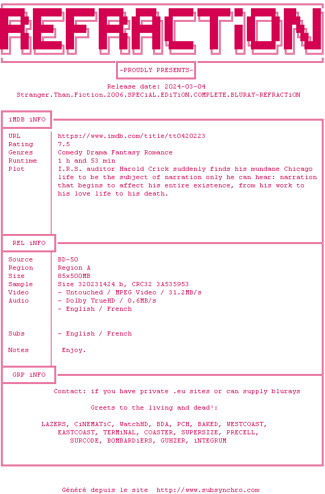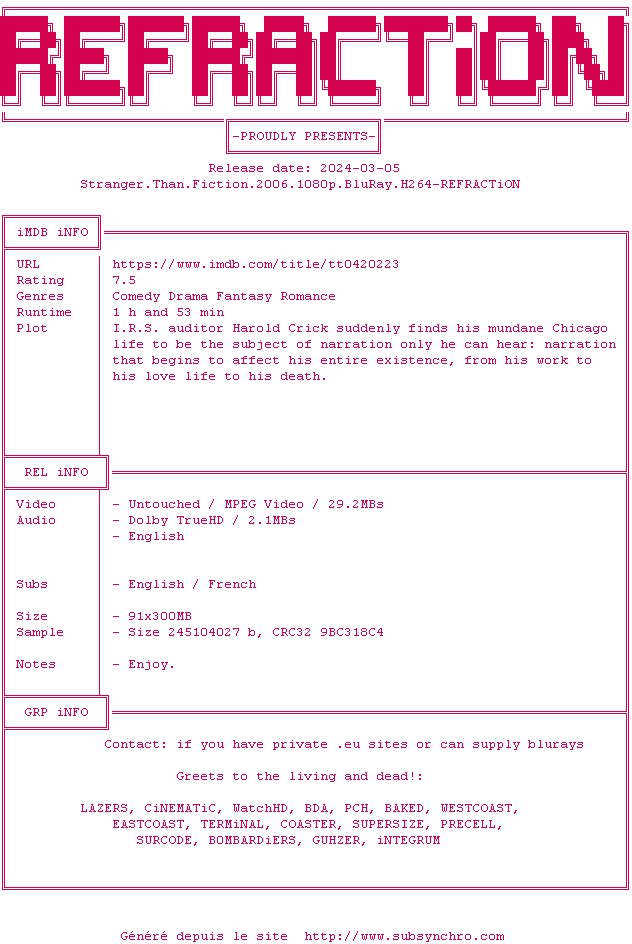 Le commentaire de buzthafuzz Commente par buzthafuzz (100), Le Mardi 12 Novembre 2013 à 10h56 Voilà un rôle de Will Ferrell inhabituel... Un très bon film, une bonne idée d&39;histoire, Emma Thompson impeccable et même si tout est mignon et parfait, on se laisse prendre. A voir en couple, Will Ferrell et Maggie Gyllenhaal sont trop chous. 7.5 / 10 1 0