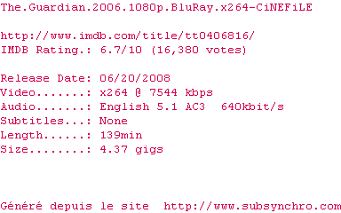 Voir le nfo de la release The.Guardian.2006.1080p.BluRay.H264-RMX