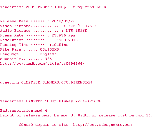 Voir le nfo de la release Tenderness.2009.PROPER.1080p.BluRay.x264-LCHD