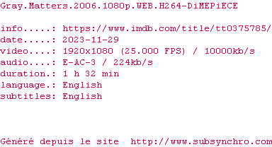 Voir le nfo de la release Gray.Matters.2006.1080p.WEB.H264-DiMEPiECE