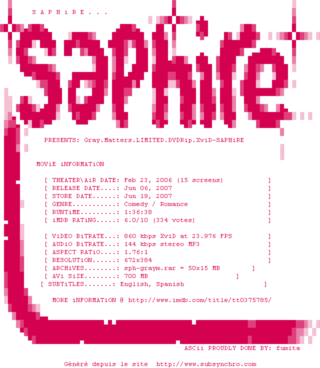 Voir le nfo de la release Gray.Matters.LIMITED.DVDRip.XviD-SAPHiRE