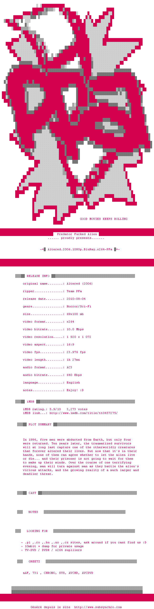 Voir le nfo de la release Altered.2006.1080p.BluRay.x264.DD5.1-FGT