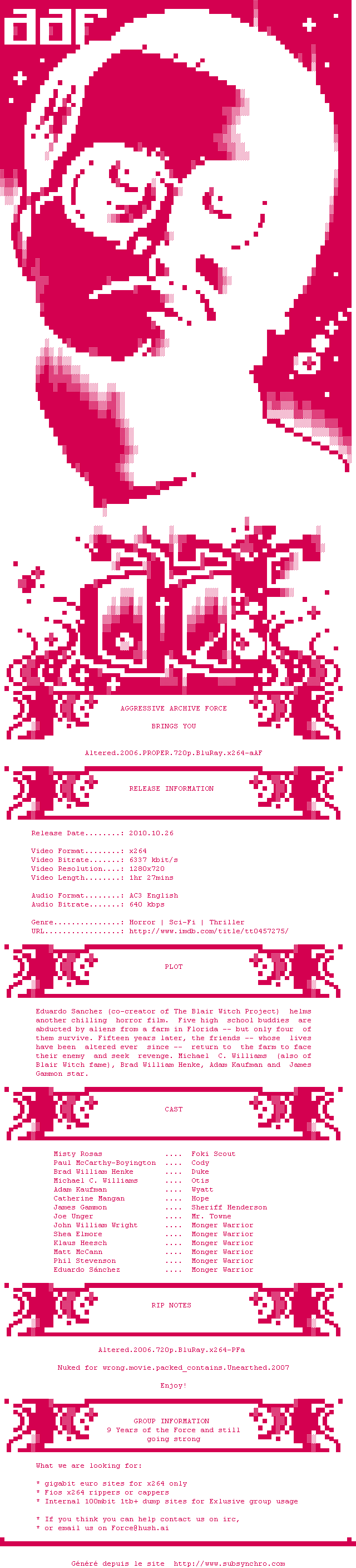 Voir le nfo de la release Altered.2006.PROPER.720p.BluRay.x264-aAF