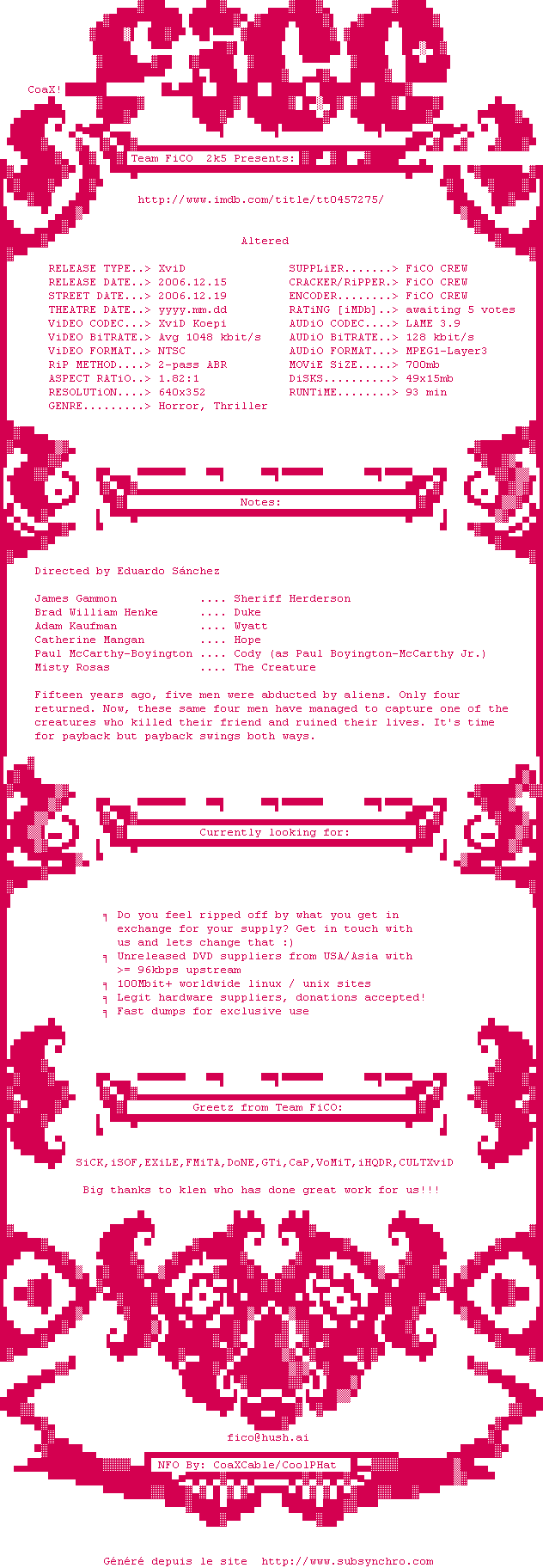 Voir le nfo de la release Altered.2006.STV.DVDRip.XviD-FiCO