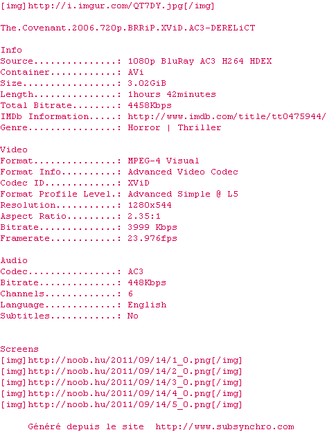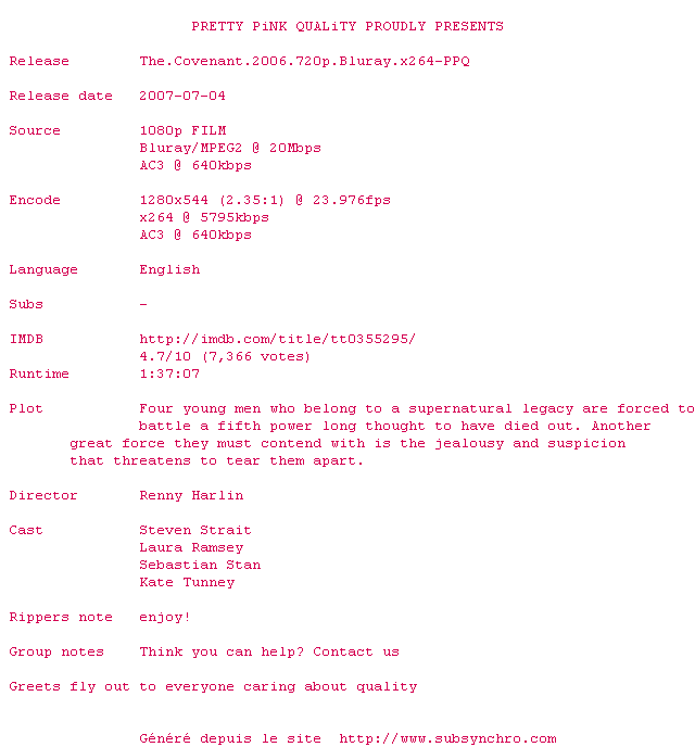 Voir le nfo de la release The.Covenant.2006.720p.Bluray.x264-PPQ