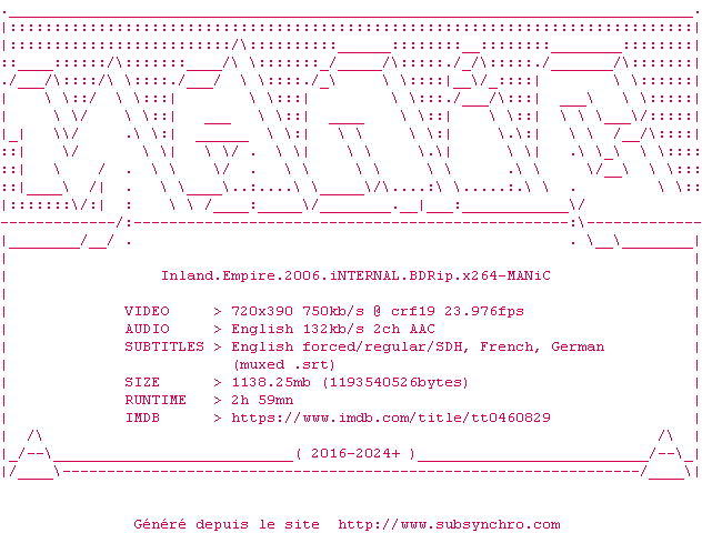 Voir le nfo de la release Inland.Empire.2006.iNTERNAL.BDRip.x264-MANiC