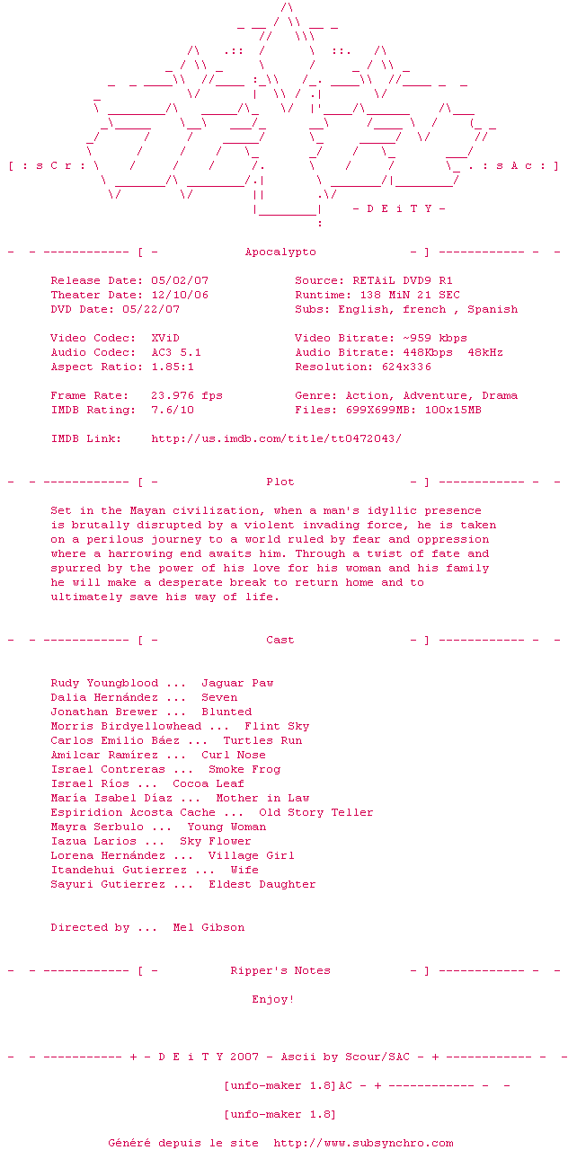 Telechargez le RSS « Fichier de la release Apocalypto.DVDRiP.XViD-DEiTY »