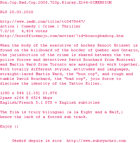 Telechargez le RSS « Fichier de la release Bon.Cop.Bad.Cop.2006.720p.Bluray.X264-DIMENSION »