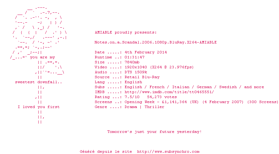 Telechargez le RSS « Fichier de la release Notes.on.a.Scandal.2006.1080p.BluRay.X264-AMIABLE »