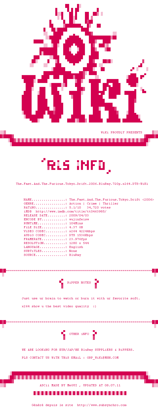 Telechargez le RSS « Fichier de la release The.Fast.And.The.Furious.III.Tokyo.Drift.2006.BluRay.720p.x264.DTS-WiKi »