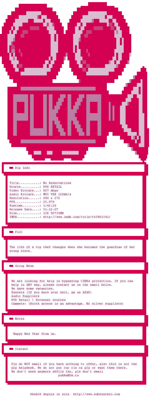 Voir le nfo de la release No.Reservations.DVDRiP.XViD-PUKKA