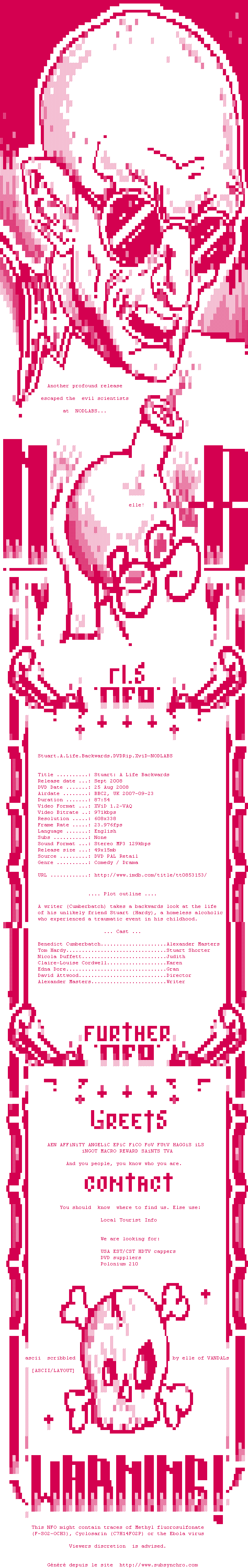 Voir le nfo de la release Stuart.A.Life.Backwards.DVDRip.XviD-NODLABS