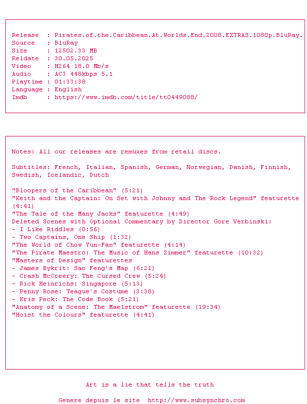 Voir le nfo de la release Pirates.Of.The.Caribbean.At.Worlds.End.2008.EXTRAS.1080p.BluRay.H264-RMXTRAS