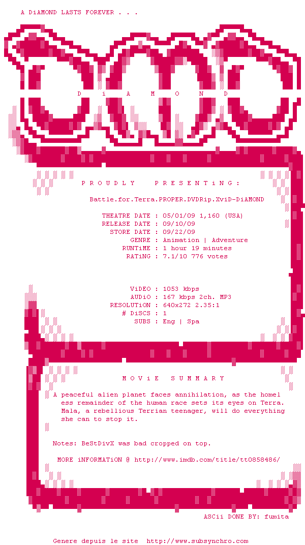 | Voir le nfo de la release Battle.for.Terra.PROPER.DVDRip.XviD-DiAMOND | DiAMOND | Battle.for.Terra.PROPER.DVDRip.XviD-DiAMOND OpenSubtitles | 0 fichier |