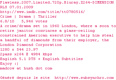 | Voir le nfo de la release Flawless.2007.Limited.720p.Bluray.X264-DIMENSION | DIMENSION | Flawless.2007.Limited.720p.Bluray.X264-DIMENSION OpenSubtitles | 0 fichier | ||