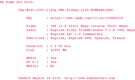 Voir le nfo de la release The.Mist.2007.2160p.UHD.BluRay.x265-B0MBARDiERS