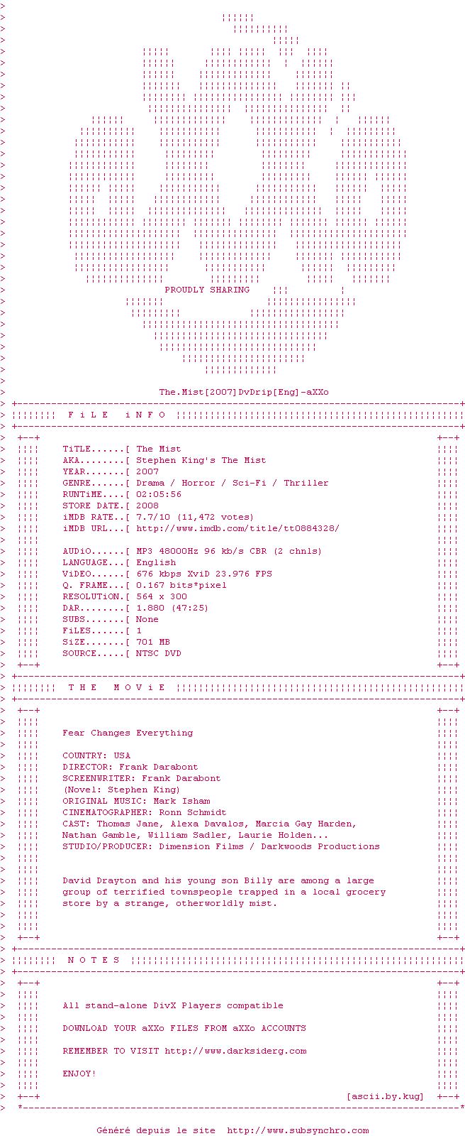 Voir le nfo de la release The.Mist.2007.DVDRip-aXXo