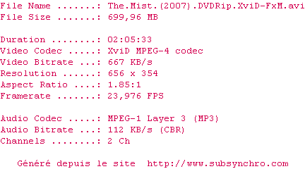 Voir le nfo de la release The.Mist.2007.BRRip.H264-MegaMaxx