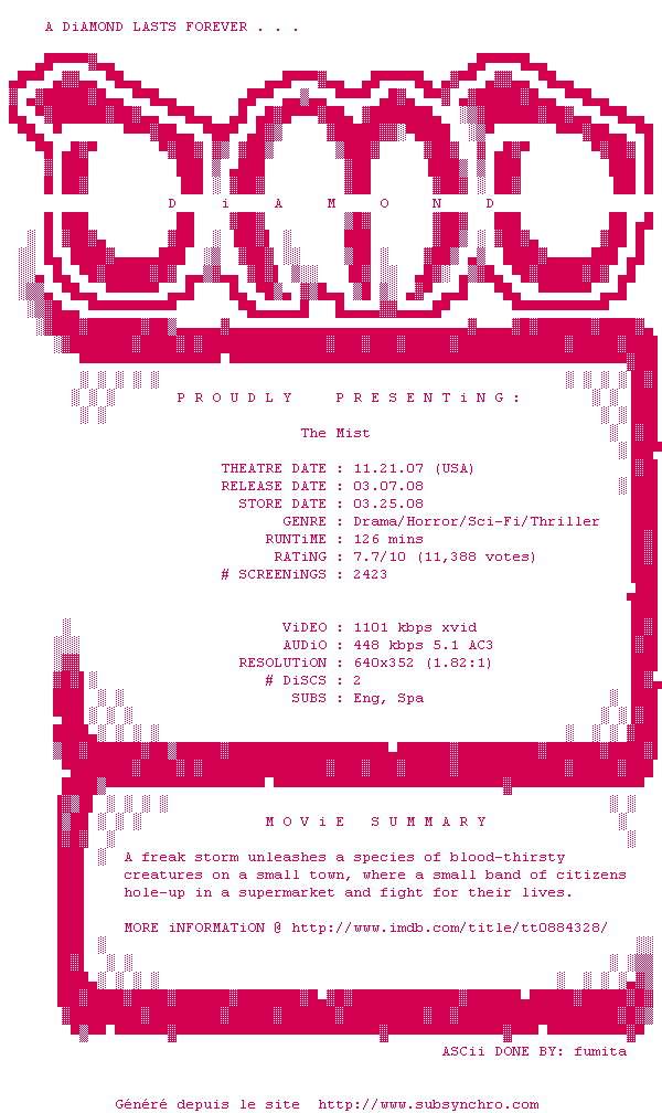 Voir le nfo de la release The.Mist.2007.DVDRip.XviD-DiAMOND