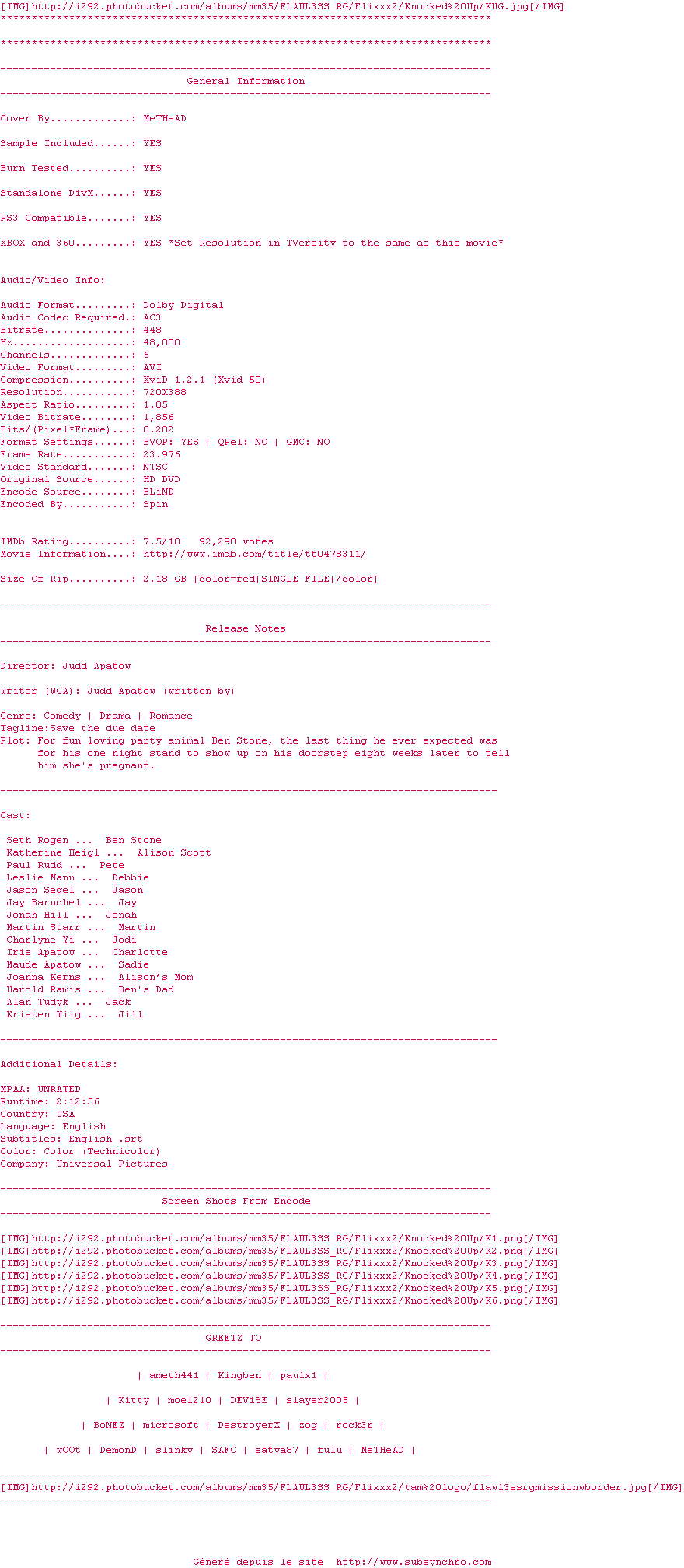 Voir le nfo de la release Knocked.Up.UNRATED.2007.HDRip.XviD.AC3-FLAWL3SS