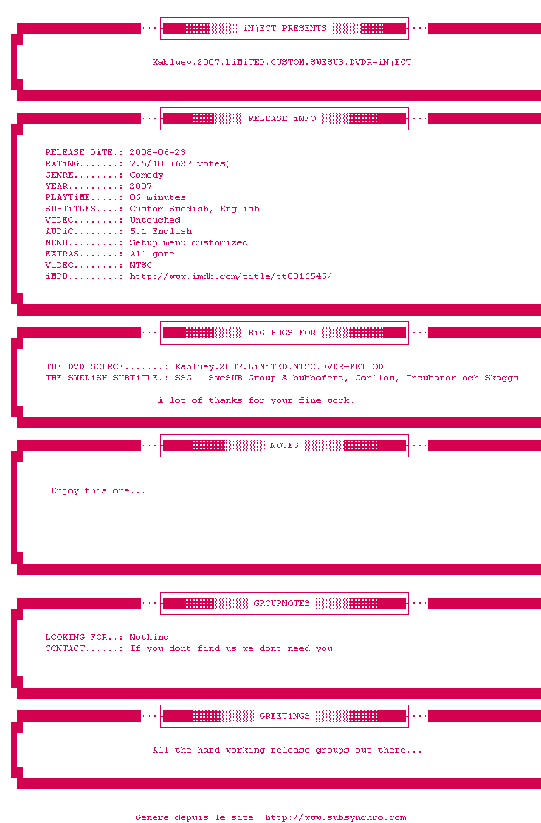 Voir le nfo de la release Kabluey.2007.LiMiTED.CUSTOM.SWESUB.DVDR-iNjECT